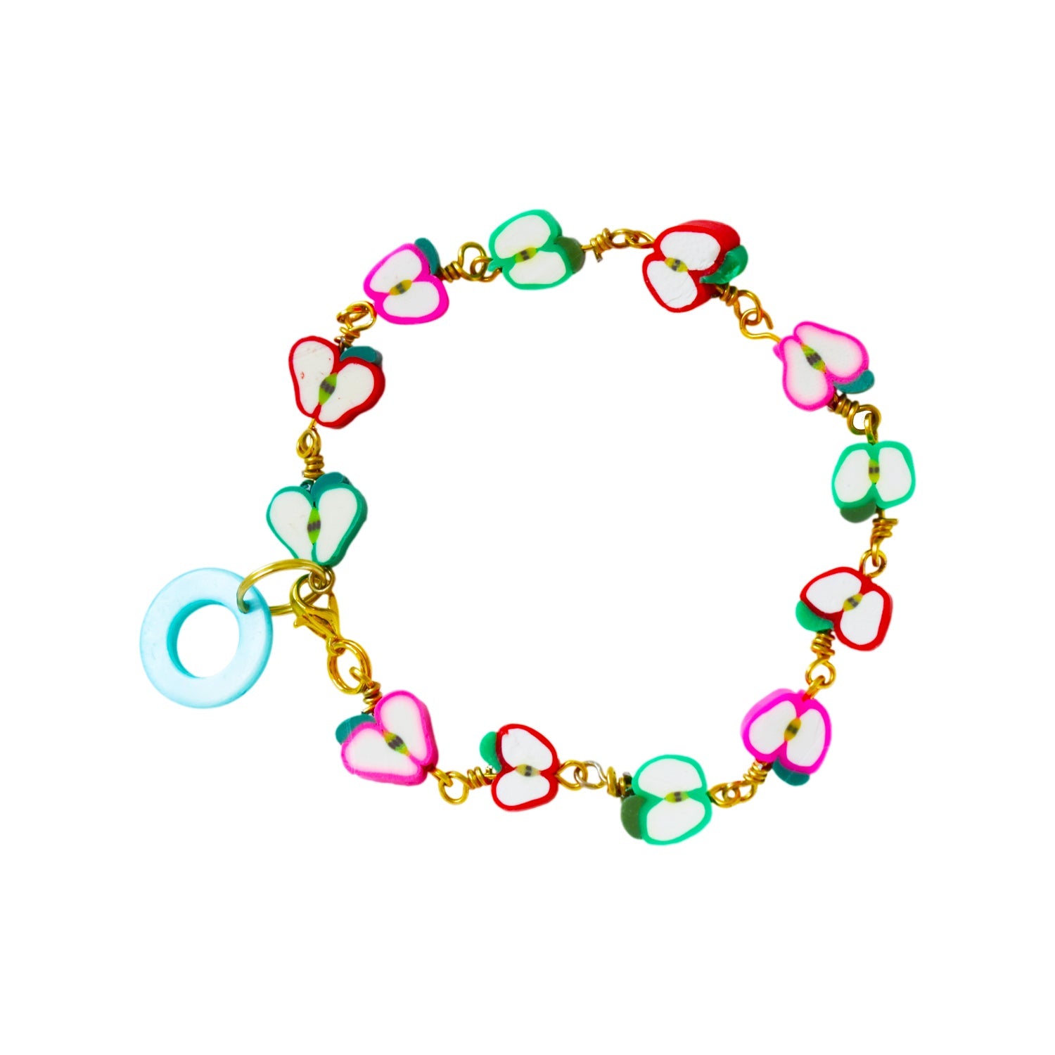 Fresh and fruity apples on a handmade bracelet. Can be adjusted to fit your wrist! Simply clasp the bracelet where it feels comfortable and let the remaining fruits dangle down. Finished with a mother of pearl bead.